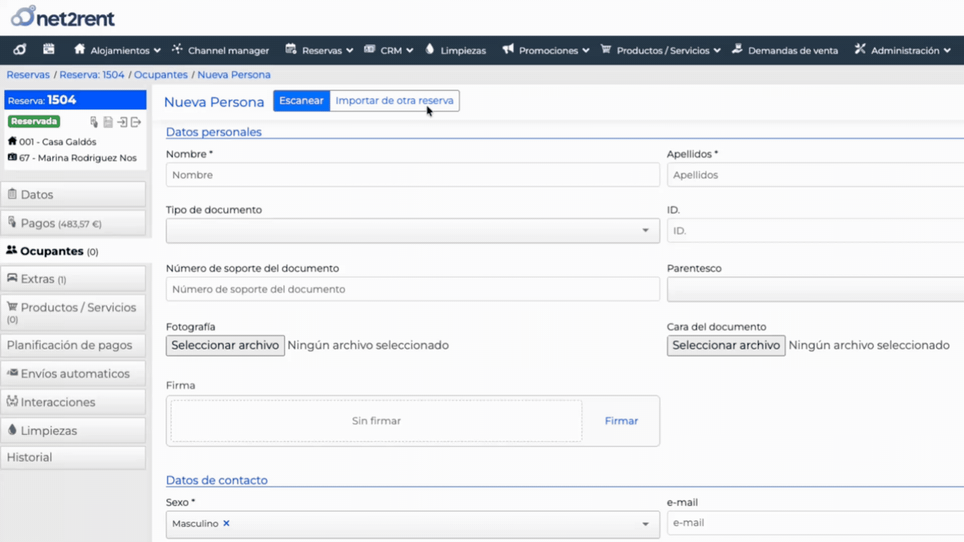 Desde el panel de Net2Rent ya es posible recoger la firma del viajero directamente en su ficha de reserva. La firma queda guardada automáticamente junto al resto de datos del huésped — nombre, documento, fechas de estancia — en un único lugar.